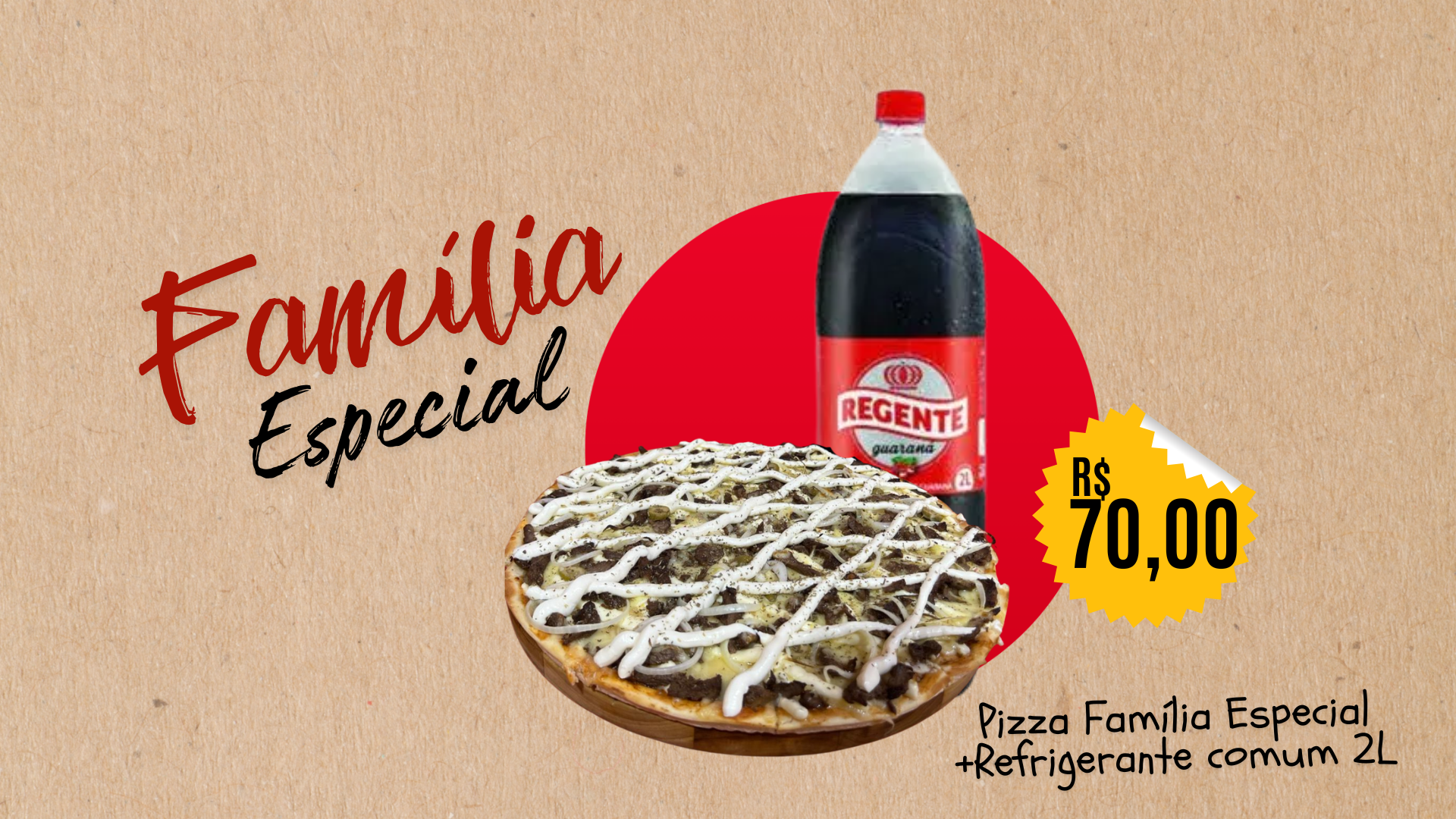 1 pizza família Especial+ 1 refrigerante 2L Comum+Embalagem (R$1,50)